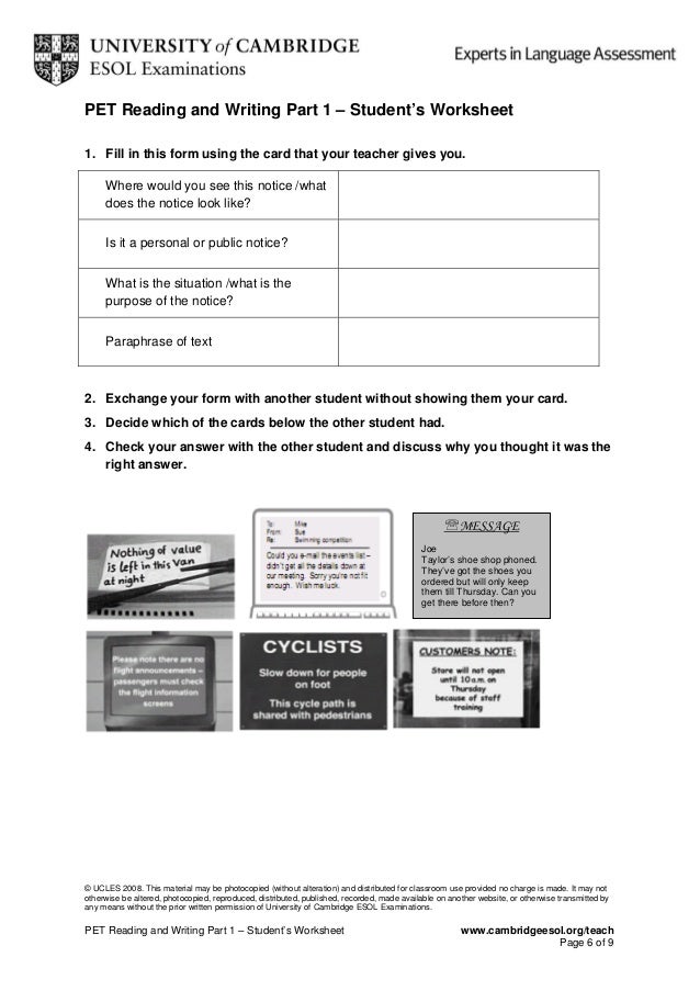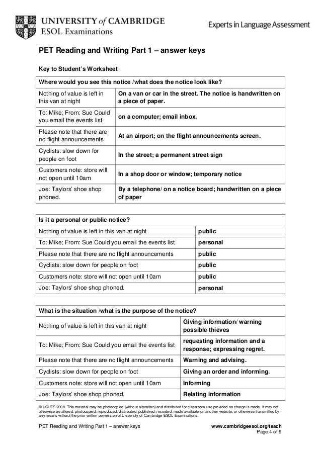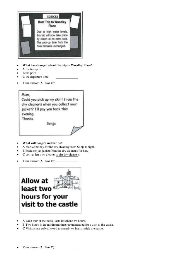 • teaching pet for schools. Reading part 1 (multiple choice). In this part you have to look at very short texts, such as signs and messages, postcards, notes, emails, labels etc. A their ability to understand the main message of a text.