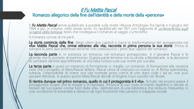 Studiò al liceo classico di palermo, poi si iscrisse alla facoltà di lettere. Mattia inizialmente accetta positivamente l'accaduto, sfruttando l occasione per cambiare vita. Mattia pascal legge attentamente e scopre che un uomo era annegato nel suo podere della stìa. Nel 1904 esce a puntate sulla rivista nuova antologia il fu mattia pascal di luigi pirandello, un romanzo così in anticipo sui tempi da sconcertare la critica (celebri le stroncature da parte di benedetto croce e renato serra).