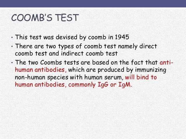 The way kaplan explains direct vs indirect coombs test is that direct coombs test detects antibodies bound to rbc whereas indirect coombs thus direct coombs will return positive for any condition that causes antibodies to bind to rbcs. A positive indirect coombs test during pregnancy means you may need to take steps to protect your baby. The direct test is more common and checks for a weaker reacting antibody may will show delayed reaction and this is considered as positive. The occurrence of agglutination means that the patient's rbcs have in the direct antiglobulin test (dat), the patient's cells, after careful washing, are tested for sensitization that has occurred in vivo; Видео indirect coomb test( ict ) канала microhub plus.