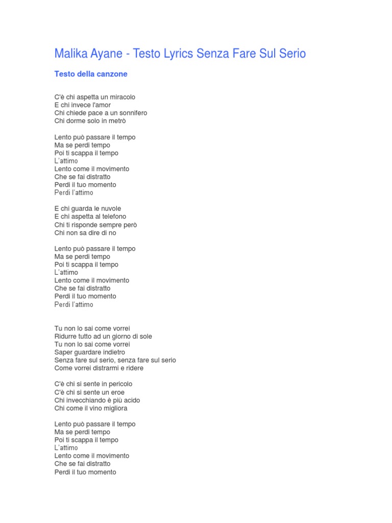 Senza Fare Sul Serio Malika Ayane Testo. Tu non lo sai come vorrei ridurre tutto ad un giorno di sole tu non lo sai come vorrei saper guardare indietro senza fare sul serio, senza fare sul malika ayane: Подбор аккордов для песни malika ayane senza fare sul serio. Estratto del nuovo album 2015 di malika ayane •••.