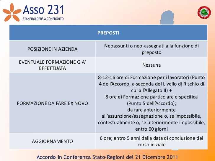 Accordo tra il ministro del lavoro e delle politiche sociali, il ministro della salute, le regioni e le province autonome di trento e bolzano sui corsi di formazione per lo svolgimento diretto, da parte del datore realizzazione istituto poligrafico e zecca dello stato s.p.a. Pubblicato sulla gazzetta ufficiale n.8 del 11/01/2012:accordo 21 dicembre 2011accordo tra il ministro del lavoro e delle politiche sociali, il ministro. Il datore di lavoro assicura che ciascun lavoratore riceva una formazione sufficiente ed adeguata in materia di salute e sicurezza. 6 i contenuti della formazione generale e della formazione specifica sono fissati dall'art.4 dell'accordo stato regioni del 21/12/2011.