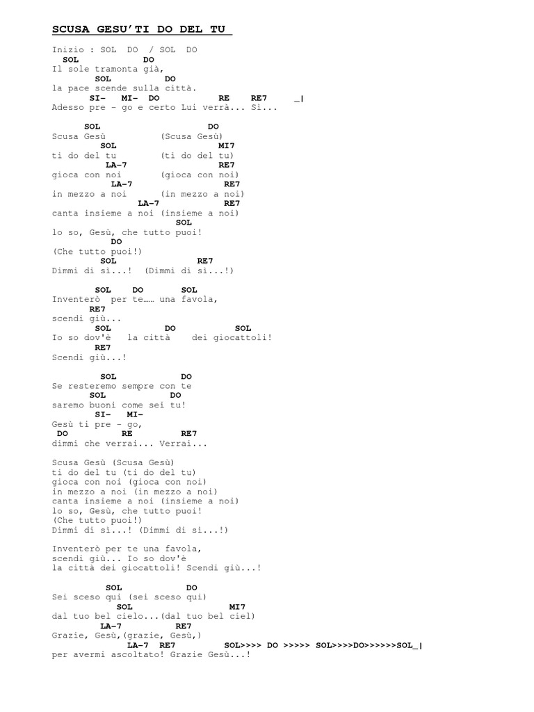 Il sole tramonta già la città dei giocattoli! Muy bien, me gustó muchísimo. Chords for scusa gesu', ti do del tu versione strumentale testo musica cristiana canti religiosi karaoke. Gesù ti prego, dimmi che verrai. Hay que tener en cuenta, no obstante, que para una confirmación absoluta de este nivel es necesario completar el test con una entrevista personal.