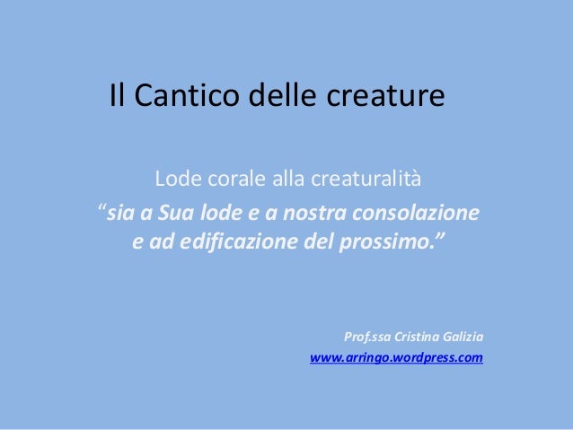 10 il cantico delle creature testo in italiano moderno altissimo onnipotente, buon signore, tue sono le lodi, la gloria e l'onore e ogni 21 religiosità e contenuti dottrinali il cantico delle creature mette in luce alcuni aspetti importanti della religiosità di san francesco: Ma il cantico delle creature era destinato anche ad un uso esterno all'ordine francescano, era rivolto a tutti i devoti, sia colti che non. Il cantico delle creature interpretato da angelo branduardi: Accoglienti ed eleganti, la camere del b&b cantico delle creature, offrono tutti i comfort necessari per garantire agli ospiti uno splendido soggiorno immersi.