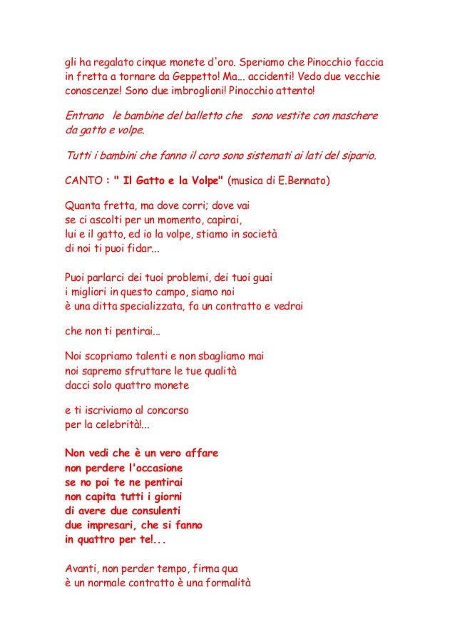 Quanta fretta, ma dove corri; Dove vai se ci ascolti per un momento, capirai, lui e il gatto, ed io la volpe, stiamo in società di noi ti puoi fidare. Il gatto e la volpe. Lui e il gatto, ed.